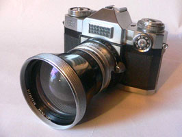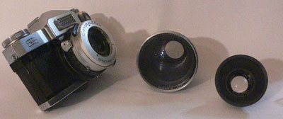 Appareil 24 x 36 assez étrange. La visée reflex ne se fait que s'il est armé car le miroir est relevé par défaut. L'ensemble obturateur/diaphragme reste solidaire de l'appareil et on doit y visser des compléments optiques pour l'utiliser, ici un 1,4 de 115mm et un 2,8 de 50. Une cellule TTL sans pile avec réglage qui s'appelle Synchro-compur . |